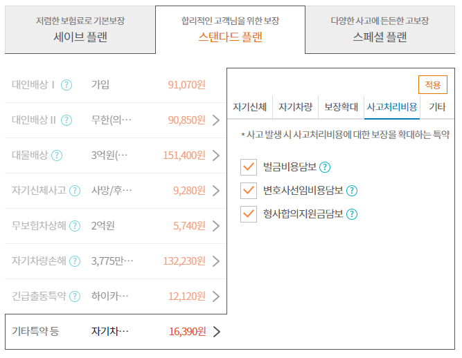 운전자 보험과 법률지원 특약의 차이점은 전체 비용과 추가 보장 내용으로 요약된다. 만 35세 남성 자가용 운전자 기준(H사)으로 법률 지원 특약(사고처리비용)은 연간 자동차 보험료에 16,390원이 더해진다. 전체 보험료 100만 원을 기준으로 하면 약 1.6%에 해당하기에 큰 부담은 아닐 것이다.