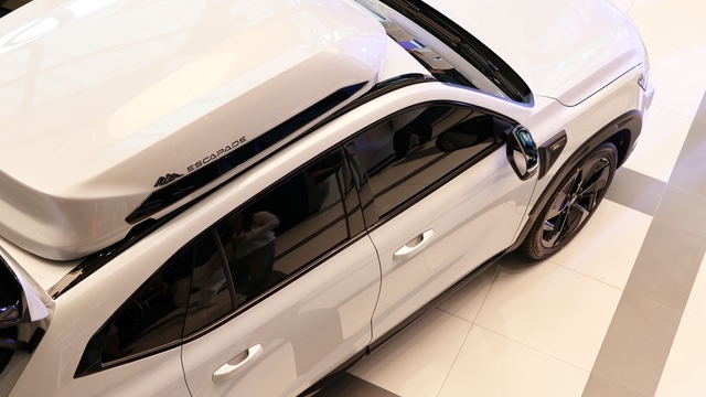 그랑 콜레오스에 신설된 스페셜 에디션 모델 '에스카파드' 트림이다. Escapade는 프랑스어로 '도시를 벗어난 여유로운 일탈 및 휴식'을 의미한다고 설명했다. 그 이름 처럼 레저 활동에 최적화된 차체 마감과 적재 공간을 갖추고 있다. 전면 범퍼 하단부는 고급스러운 색감의 플라스틱 실드가 적용된 모습이고, 휠아치에도 전용 가니시가 부착되어 있다. 프런트 펜더 상단부에는 전용 가니시를 부착하여 차별화를 꾀했다. 차체 중앙부에도 언더커버가 강화된 모습, 개인적으로 전면보다는 후면 범퍼 하단에 부착된 가니시가 더욱 역동적으로 보였다.